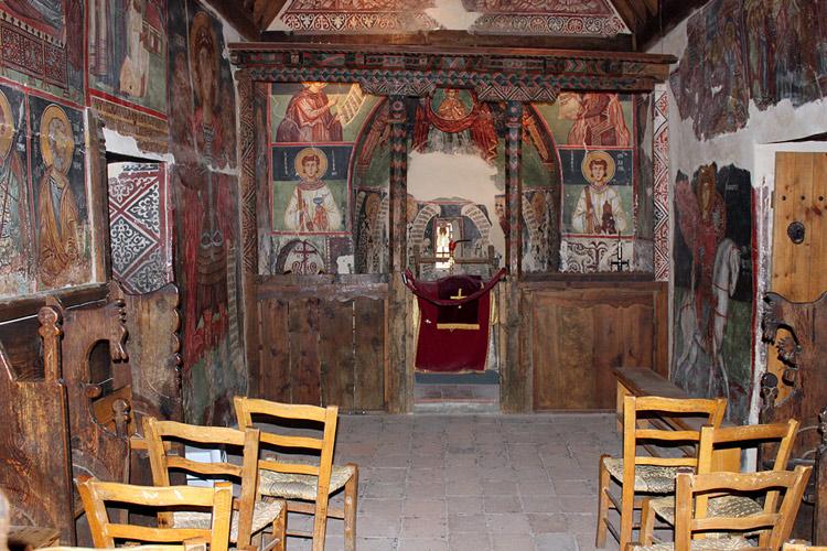 Маленькая, однонефная, с деревянным перекрытием и черепичной кровлей, церковь эта хранит уникальные фрески живописца Минаса из Мирианфуса. Фигуры на фресках изображены в византийской традиции: плоские, с пристальными, сосредоточенными, но как бы не сфокусированными на зрителе взглядами.