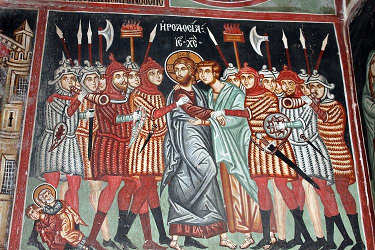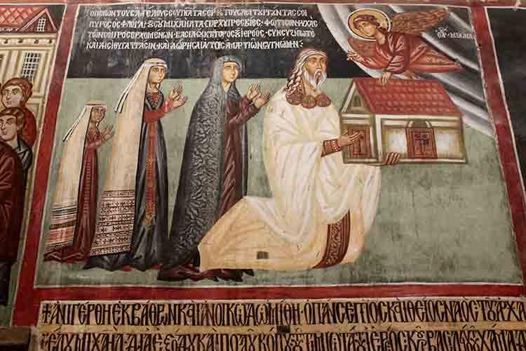 Почти вся Божественная история проходит перед нами, запечатленная на фресках старого храма: одиннадцать сюжетов Праздничного цикла, образы святых, сцены Распятия и Воскресения, история Нового Завета, Рождество Богородицы, Введение Марии во храм, Благовещение, Рожество Христово, Сретение, Крещение, вход в Иерусалим, предательство Иуды...