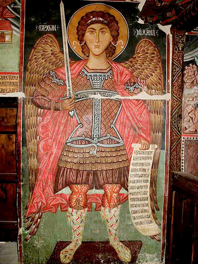 Победивший бесовские силы, Архангел Михаил сопровождает души умерших в царство мертвых. Он всегда изображается воином: взгляд его спокоен и суров, в руках его меч. Любопытный факт: Архангел Михаил часто изображается в доспехах византийских военачальников, а порой и императоров, как бы напоминая прихожанам о той высшей власти, которой он наделен, одновременно подчеркивая и то, что божественной властью были наделены и сами византийские правители.