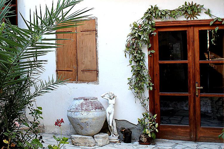 Пройдя через глухие деревянные ворота в каменной стене вы оказываетесь в уютном дворике. Здесь всегда много зелени, горшков с цветами, а крышей его часто служат старые виноградные лозы – они являются и частью декорации, и защитой от палящего солнца, и ежегодно приносят сочные плоды – виноградную ягоду.