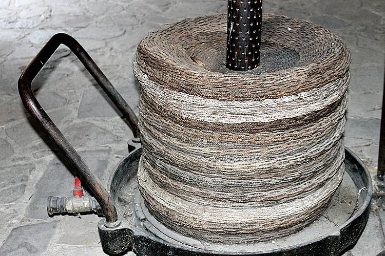 Обратитие внимание на простой и гениальный способ процеживания оливкового жмыха: после того, как оливки вместе с косточками перетерты жерновом, они, превратившиеся в густую массу, выкладываются на “фильтр” - плетеные из натуральной веревки коврики, уложенные друг на друга в несколько слоев. Масло медленно процеживается сквозь слои веревки, а остатки мякоти и косточек отфильтровываются, застревая в ее волокнах. Биологически чистый способ получения оливкового масла холодного отжима!