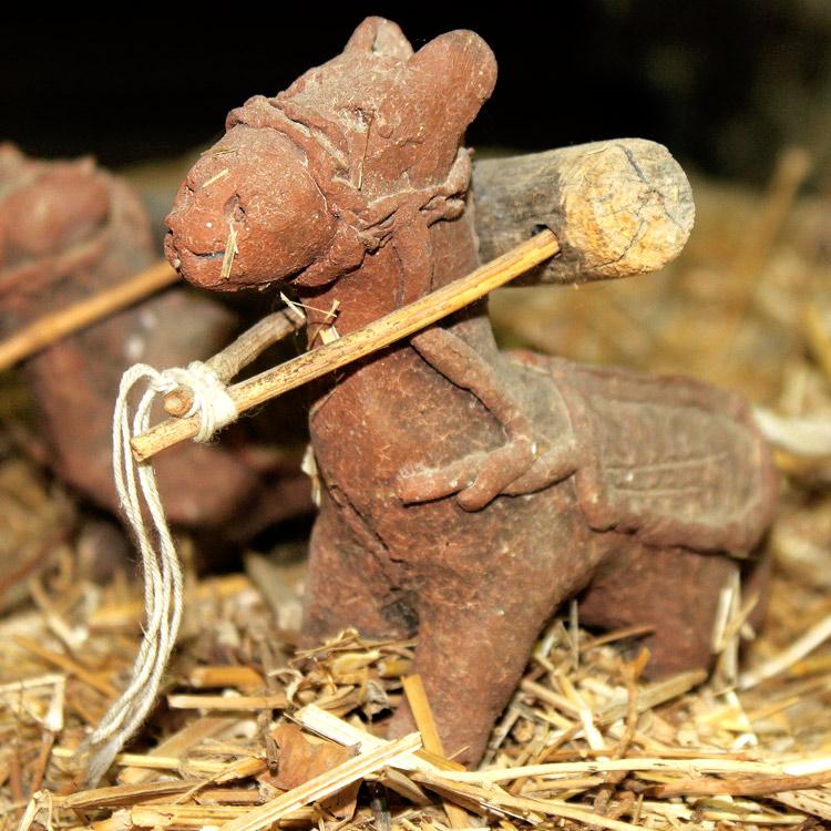 Посуда в доме простого крестьянина была глиняная, хрупкая, и потому кухонную утварь приходилось часто обновлять. Гончарным делом для изготовления небольших предметов быта часто занимались женщины, а во дворах домов стояли специальные печи для обжега изделий из глины. Из глины, в том числе, изготавливали и игрушки для детей. На этой фотографии вы видите запечатленную в глине бытовую сцену: ослик в упряжке пашет землю.