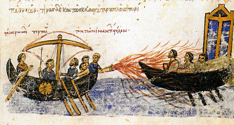 Греческий огонь широко использовался во время арабо-византийских войн. С помощью специальных устройств по метанию огня греки поджигали корабли противников.