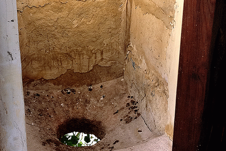 Обратите внимание на устройство туалета в этой древней постройке. Он находится на последнем этаже, и представляет собой небольшую отдельную комнатку, как бы нависающую над фасадом башни. В полу этой крохотной комнаты проделано круглое отверстие. Заглянув в него вы увидите дворик башни и центральный вход в нее. Вот так, без церемоний, защитники пути в долинуМесаория, справляли свою нужду.