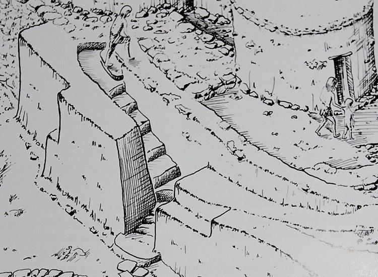 Итак, деревня представляла из себя закрытый мир, с четко ограниченной территорией. Существовал один главный вход в эту деревню, который, вероятно, охранялся. Интересна архитектура главного входа: он представляет собой не простое “отверстие” в стене для проникновения в деревню, а целый комплекс построек. Сам вход в деревню был на 2 метра выше земной поверхности, на которой он был построен. Ещё этот “комплекс” включал в себя десятиметровую каменную лестницу со ступенями шириной 80см и высотой 30-40 см, ведущую к главному входу в поселение. Подступ к поселку усложнялся ещё и тем, что каменная лестница была извилистой, а также сужалась на подступах к самому входу. (смотрите иллюстрацию).