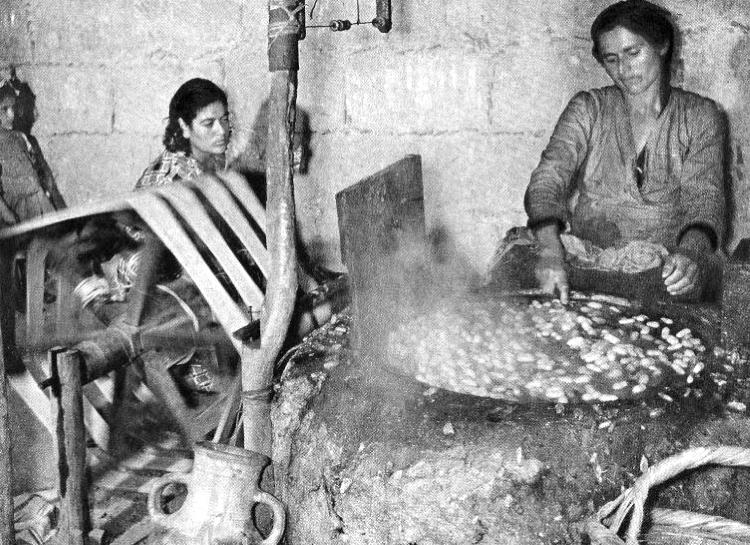 Как вы думаете, чем заняты эти женщины? Они вымачивают в кипящей воде коконы шелкопряда!