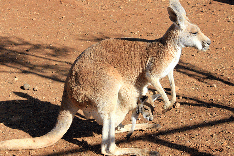 И тут я увидела самую лучшую сцену дня – из каменной пещеры, сооруженной в центре загона, вышла мама-кенгуру, в сумке которой сидел детеныш! Сидел, лениво свесив голову из уютной теплой маминой сумки, и, слегка прищурив глаза, наблюдал за собратьями.