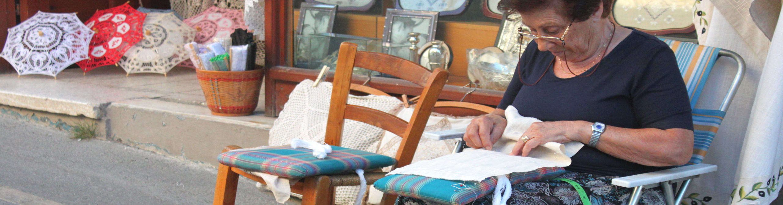 Прогулявшись по узеньким улочкам Лефкары, вы увидите женщин, сидящих возле своих каменных домиков с вышивками в руках. Согласитесь, уже этот факт придает деревне неповторимый колорит! В XXI веке вышивающих на улице женщин вы встретите нечасто, не правда ли? Вспомните пожалуйста, кто из ваших нынешних знакомых вышивает? Вариант “Моя бабушка вышивала” не считается! Немногие смогут назвать три имени, еще меньшее число людей вспомнят пятерых любительниц вышивки, а вот десять имен вряд ли удастся кому-либо припомнить. А в современной Лефкаре сегодня вышивают десятки коренных жительниц! И не только дамы пенсионного возраста, как подумали сейчас некоторые из вас. На улицах Лефкары вы увидете сорокалетних, тридцати и даже двадцатилетних вышивальщиц. Нужно признать, однако, что последних не так уж много.