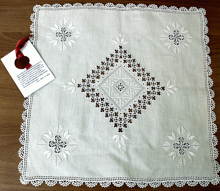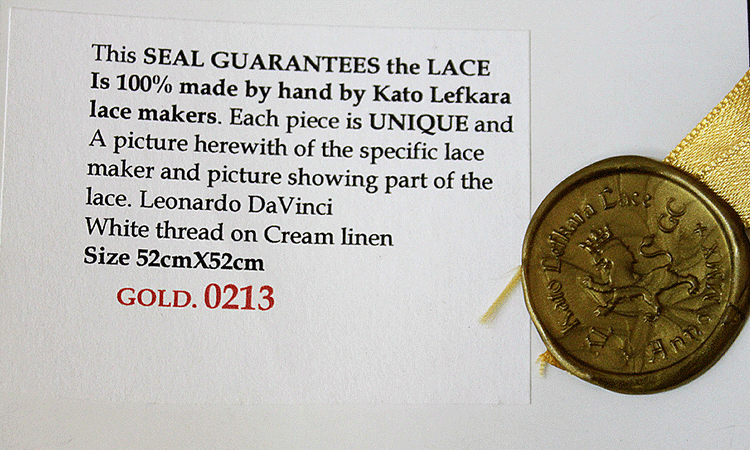 Маленький сертификат, прикрепляемый к кружеву. Он является свидельством того, что эта работа Евдокии получила золотую медаль ЮНЕСКО. Надпись на нем гласит: “Эта печать является гарантией того, что это кружево - стопроцентная ручная работа, выполненная мастером из деревни Като Лефкара. Каждый образец уникален. На каждом прилагаемом сертификате есть фотография мастера, а так же фотография с фрагментом кружева. Леонардо Да Винчи. Белая нить на льне кремового цвета. Размер 52 на 52 см. Золотая медаль. Регистрационный номер 0213”