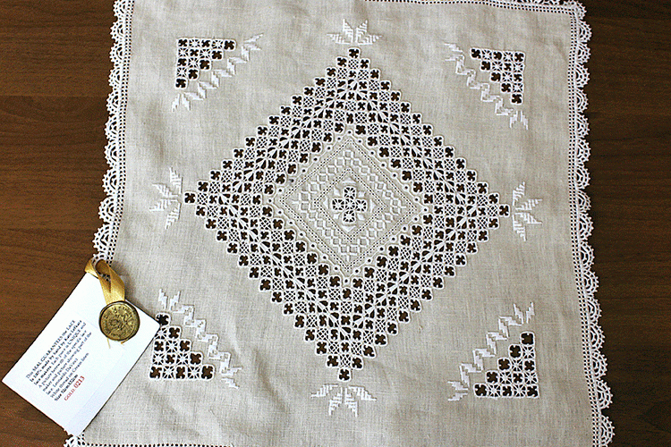 Это одна из работ Евдокии. Она находится под охраной ЮНЕСКО, о чем свидетельствет надпись на большом сертификате и на маленьком сертификате, который всегда крепится к кружеву.