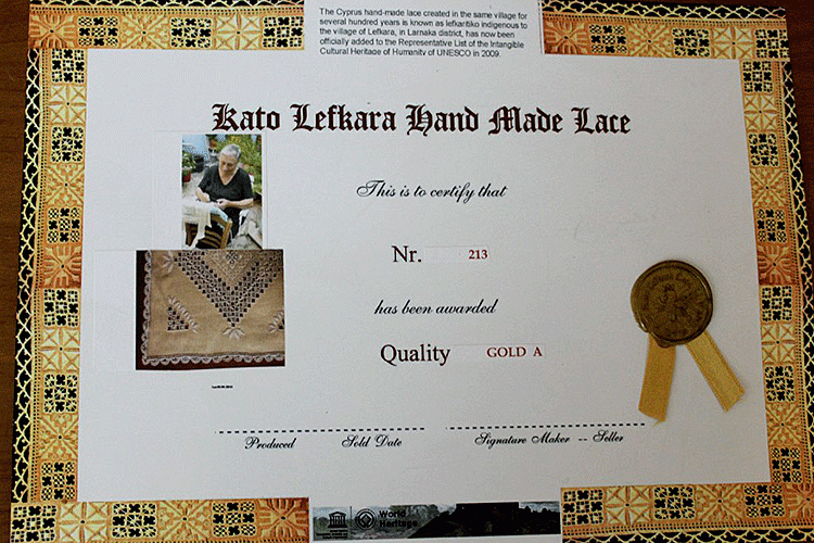 Надпись на сертификате, который покупатель салфетки или скатерти в Лефкаре получает при покупке, гласит: “Кипрское кружево ручной работы, известное как “лефкаритика”, создаваемое в одноименной деревне на протяжении столетий. Происходит из деревни Лефкара, район Ларнака. Было официально добавлено в лист национальных достояний ЮНЕСКО в 2009 году. На сертификате также есть фотография мастерицы, создавшей эту вышивку, фотография рисунка вышивки, сертификационный номер, под которым эта работа зарегистрирована в ЮНЕСКО, и стоит либо красная, либо золотая печать этой организации.