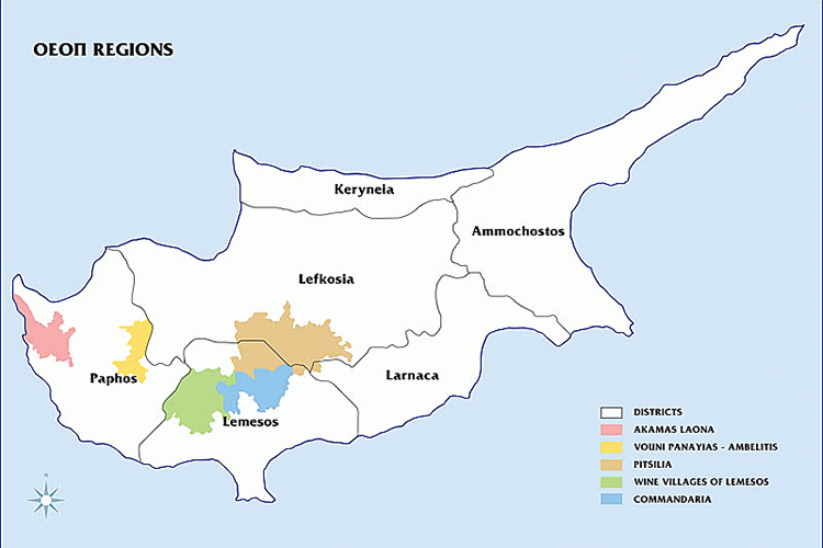 До 2004 года все сорта кипрских вин причислялись к столовым винам. Вступление в Европейский Союз, однако, потребовало нового законодательства, которое позволило бы более профессионально классифицировать вина, произведенные на острове. В результате были определены четыре основных винодельческих региона, которые выпускают определенные сорта вин с контролируемыми и официально закрепленными названиями и местами произрастания винограда.
